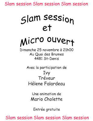 Le lendemain, le 13 novembre aura lieu une autre soirée de slam. Au cégep du Vieux Montréal (256, rue Ontario est, au local 882). Isabelle St-Pierre, Ivy, Marie-Paule Grimaldi, Jocelyn Thouin, Rebell Trankill, Hélène Falardeau et Treveur. Superbe brochette. Une animation de Mario Cholette !
